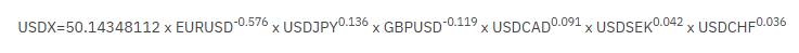 Where the value in the formula is positive when the US dollar is the base currency; and negative when it’s the quote currency. The first factor, 50.14348112, is the index’s historical value of 100 on the start date of the reference.
